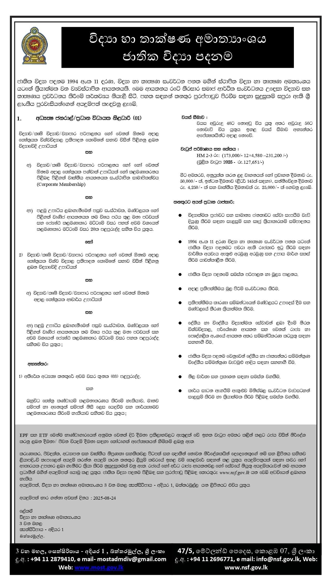 පුරප්පාඩු - අධ්යක්ෂ ජනරාල්/ ප්රධාන විධායක නිලධාරී, ජාතික විද්යා පදනම