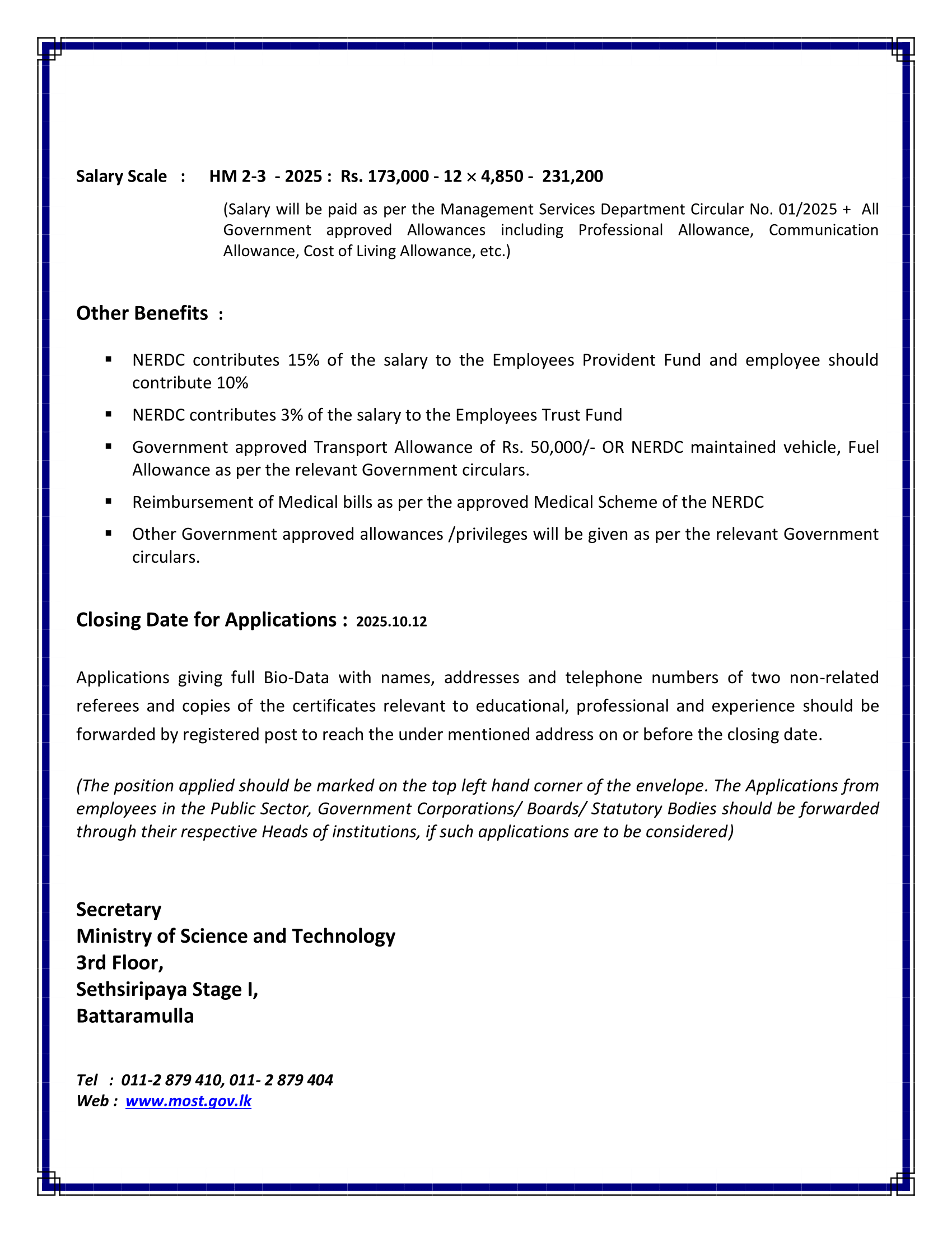 Vacancy - Director General, NATIONAL ENGINEERING RESEARCH & DEVELOPMENT CENTRE OF SRI LANKA (NERDC)